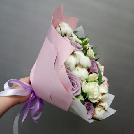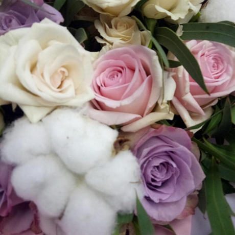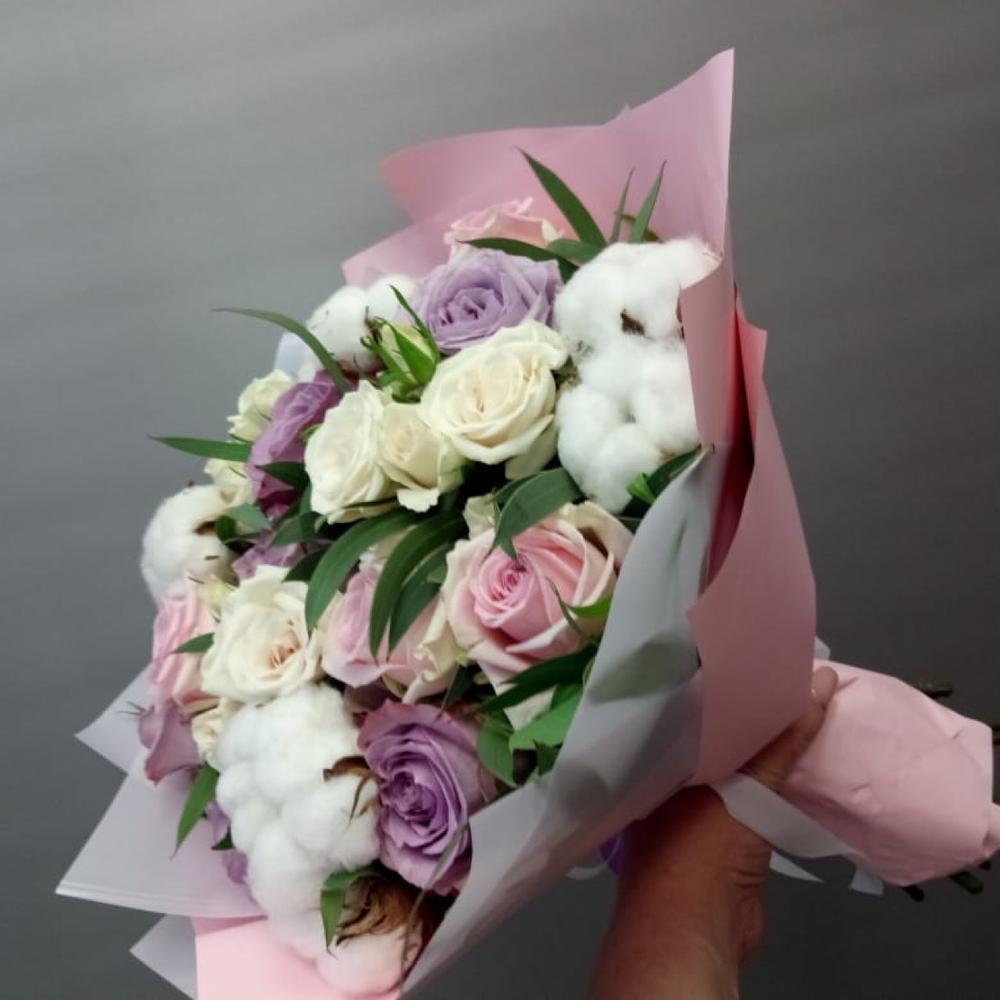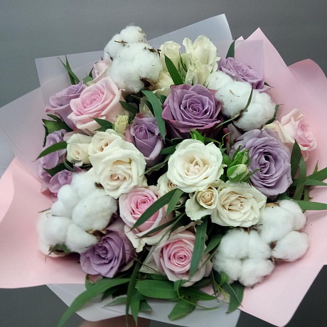 Закажите Букет из роз и нежного хлопка с доставкой в Москве и МО.