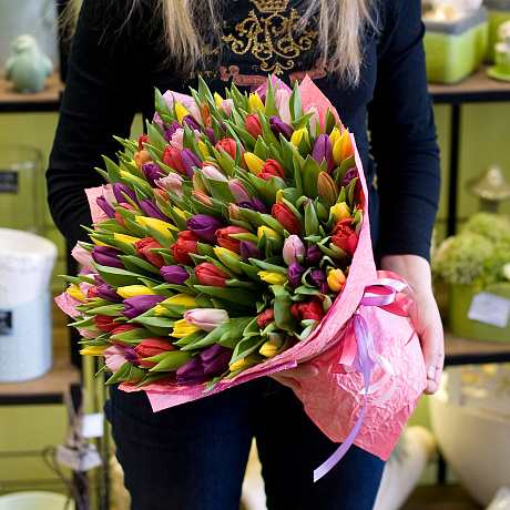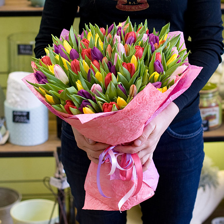 Букет из тюльпанов "Разноцветные тюльпаны микс" — отличный выбор для подарка! На сайте вы найдете красочные фотографии, которые помогут сделать выбор. Цена букета — 14850 руб.