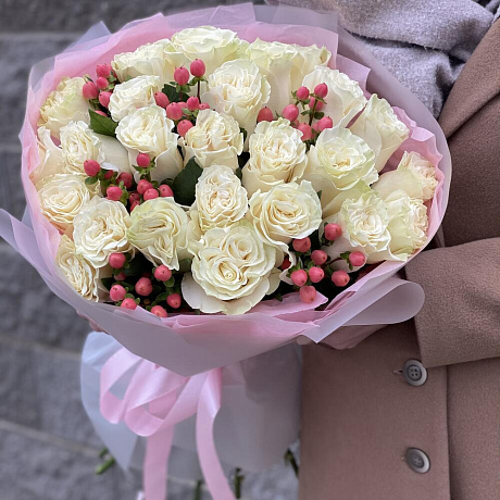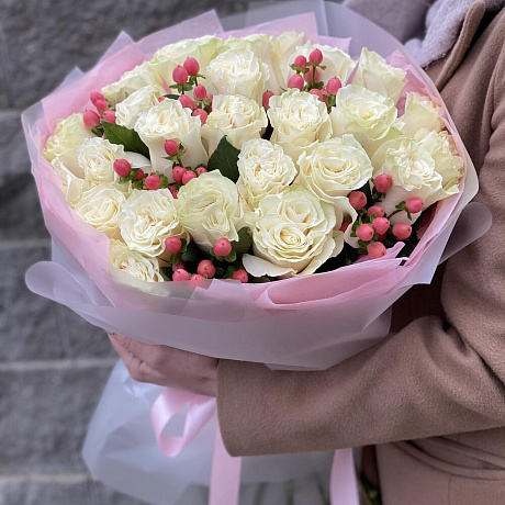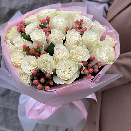 Закажите Букет Классика с акцентом из белых роз и гиперикума с доставкой в Москве и МО.