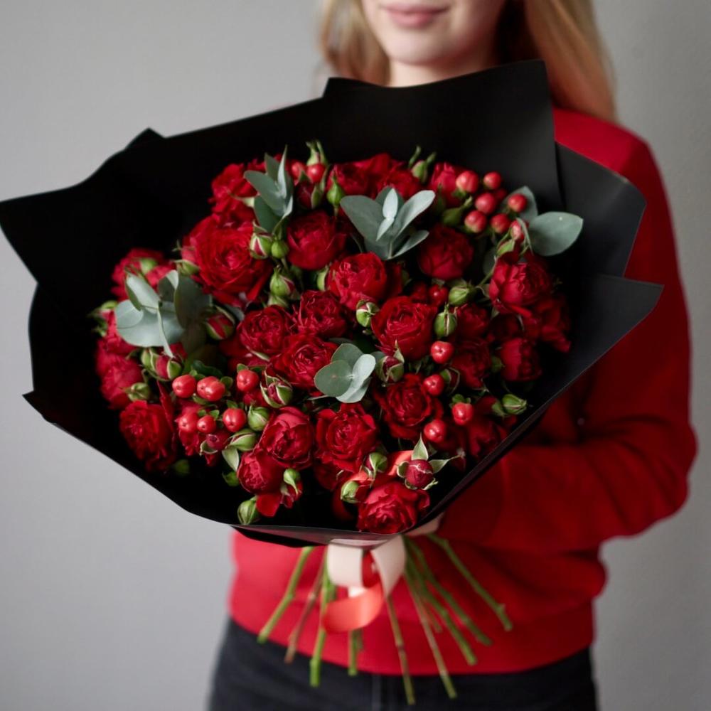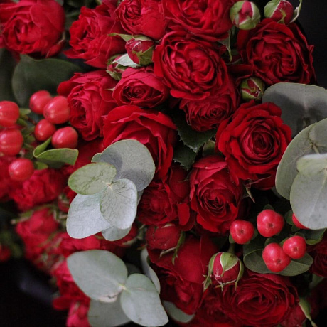 Закажите Букет красных роз с гиперикумом с доставкой в Москве и МО.