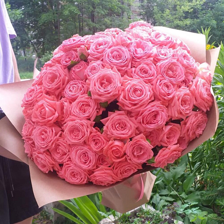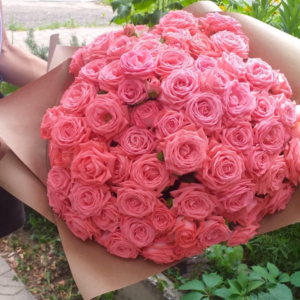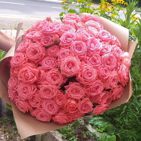 На фото - Букет кустовых роз Барбадос. В составе данной композиции: Роза кустовая - 25 шт.; Крафт бумага - 1 шт.; Лента - 1 шт..