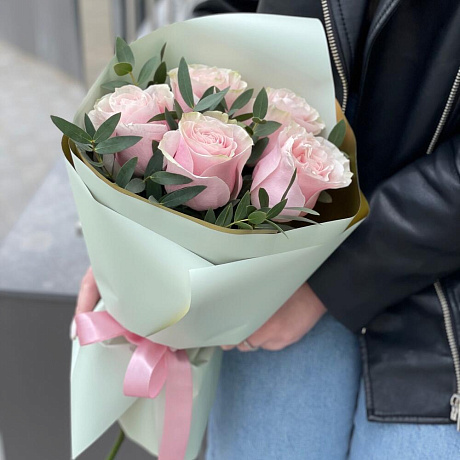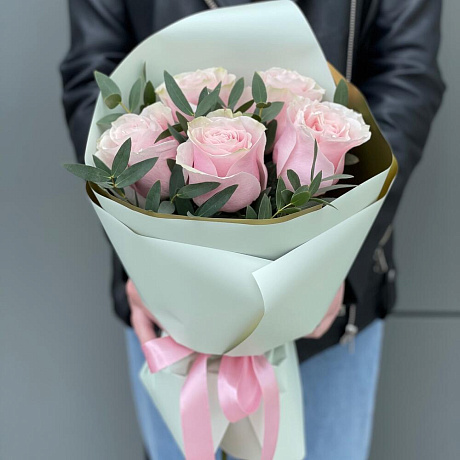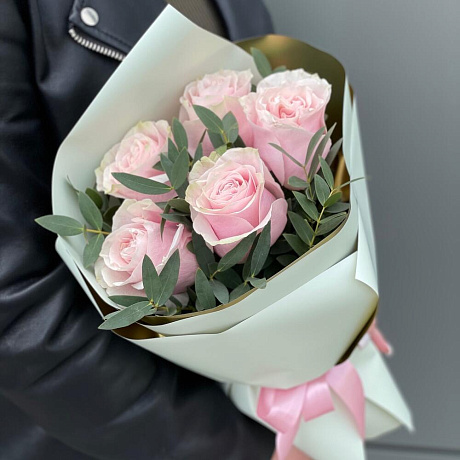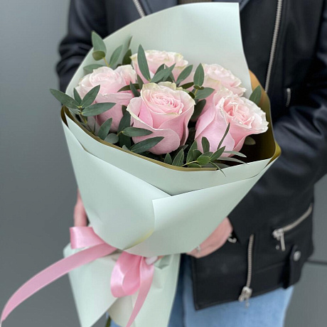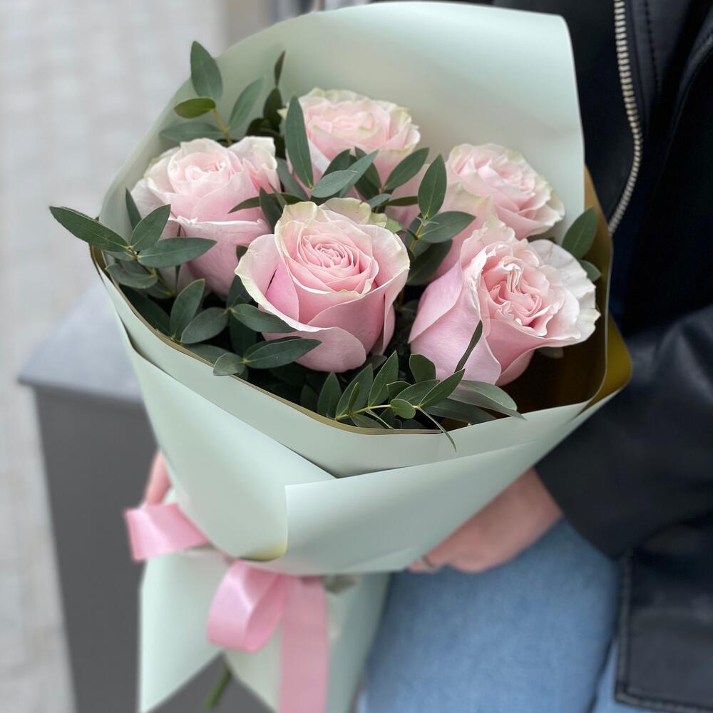 Закажите Букет Женственный из 5 роз и эвкалипта с доставкой в Москве и МО.