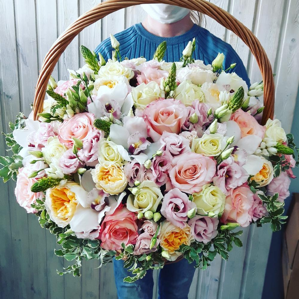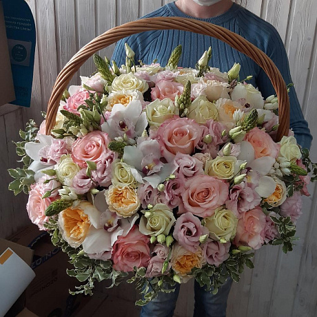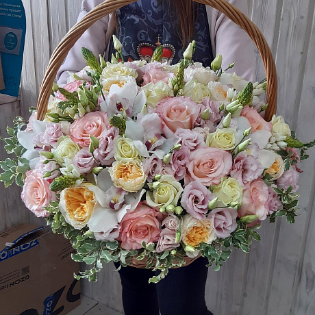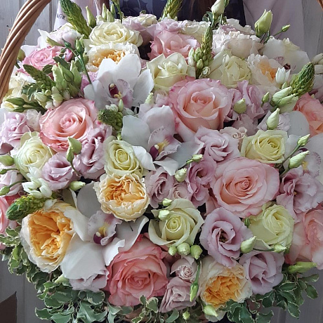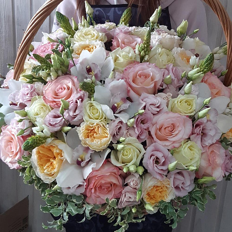 На фото - Букет цветов "Парижанка". В составе данной композиции: Роза остина пионовидная - 15 шт.; Роза пионовидная белая - 15 шт.; Роза охара 50 см Александра Фармс - 15 шт.; эустома пинк алиса - 10 шт.; Питтоспорум пучок - 1 шт.; Орхидея Цимбидиум - 9 шт.; корзина плетеная средняя - 1 шт.; Оазис - 4 шт..