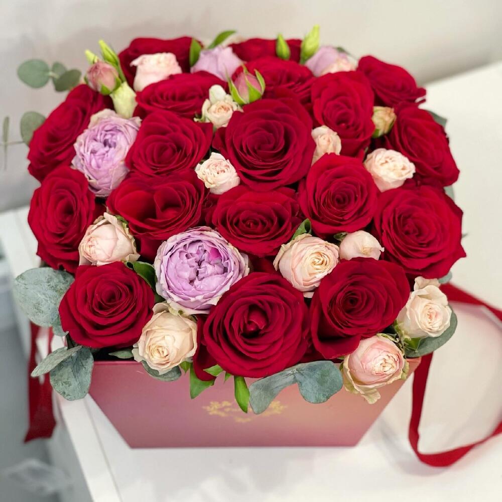 На фото - Цветы в коробке №406. В составе данной композиции: Роза Эквадор - 17 шт.; Роза кустовая пионовидная - 3 шт.; Эвкалипт - 3 шт.; Оазис - 1 шт.; Коробка - 1 шт..