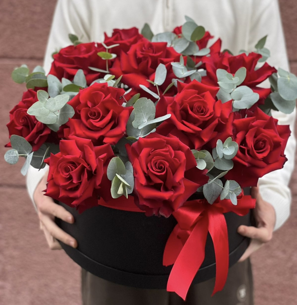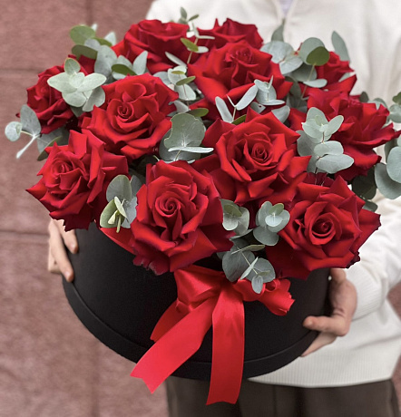 На фото - Композиция цветов №197. В составе данной композиции: Роза Эквадор - 11 шт.; эвкалипт, коробка.