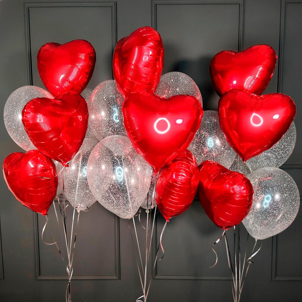Закажите Композиция красных сердец и прозрачных с серебряными блестками с доставкой в Москве и МО.