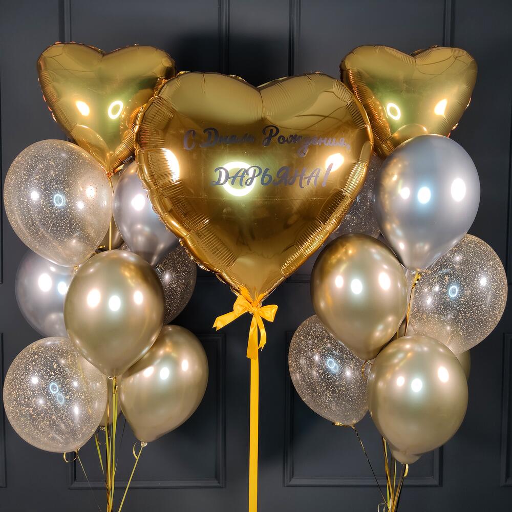 Композиция с большим золотым сердцем и фонтанами с сердцами — отличный выбор для подарка! На сайте вы найдете красочные фотографии, которые помогут сделать выбор. Цена букета — 8200 руб.