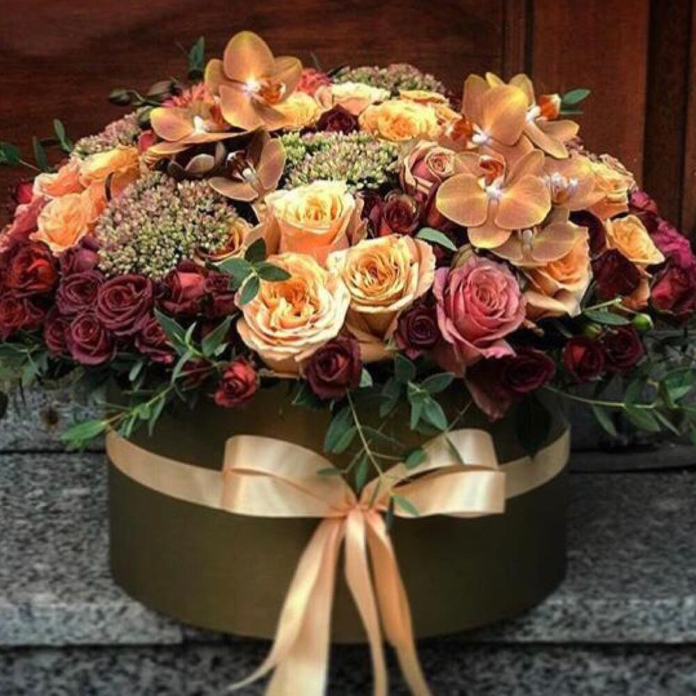 Состав: Фаленопсис - 1 шт.; Коробка - 1 шт.; Оазис флористический - 2 шт.; Роза Эквадор - 15 шт.; Роза кустовая - 15 шт.; Писташ - 1 шт.; Трахелиум - 6 шт.