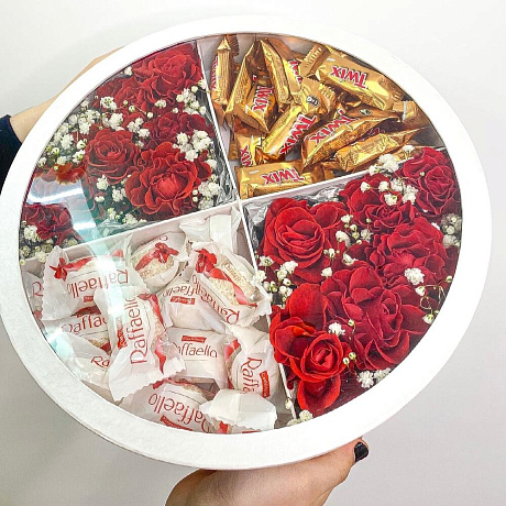 Закажите Коробка с цветами, Рафаэлло и Твиксом с доставкой в Москве и МО.