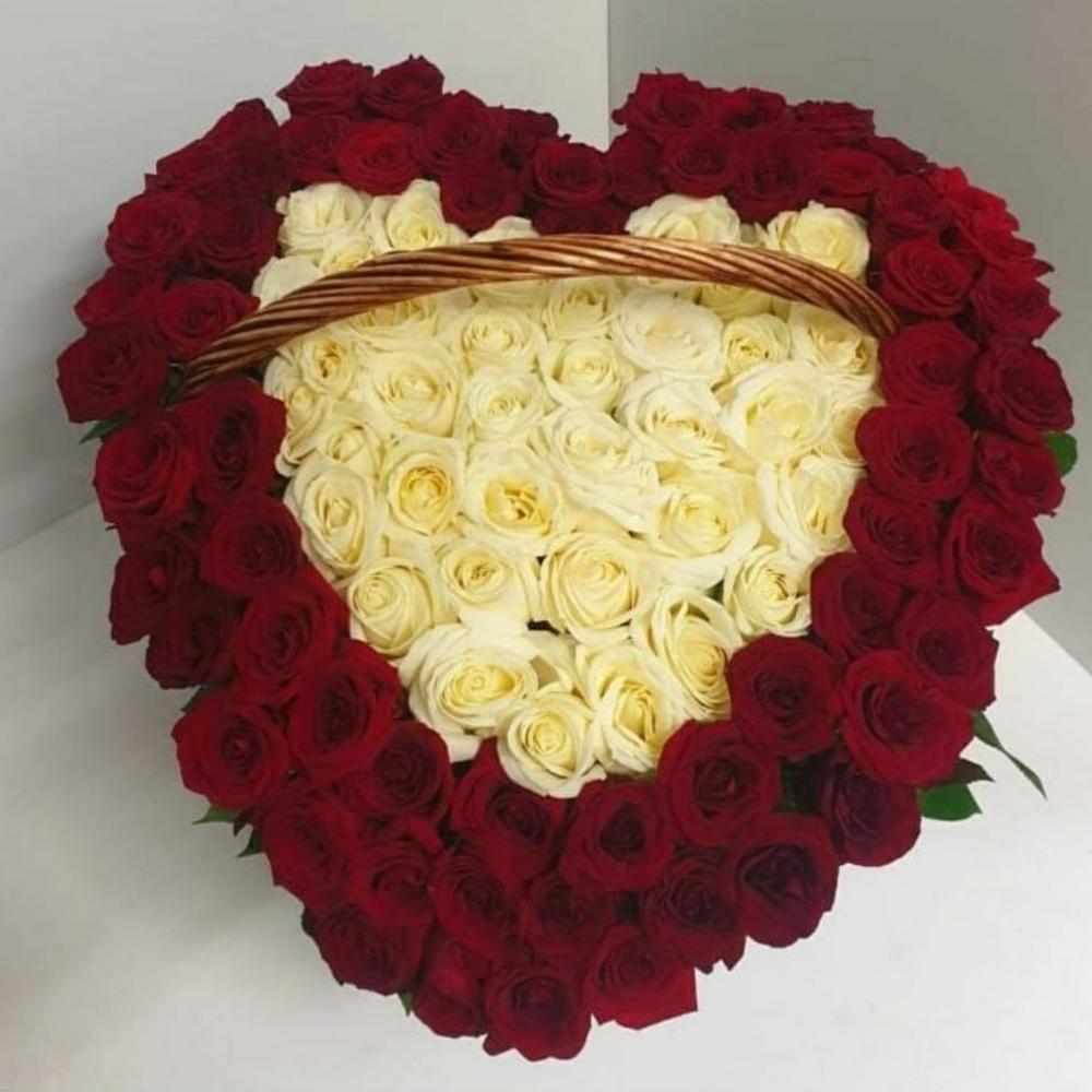 На фото - Корзина с цветами "Сердце" №2. В составе данной композиции: Роза red naomi - 51 шт.; Роза Аваланж - 50 шт..