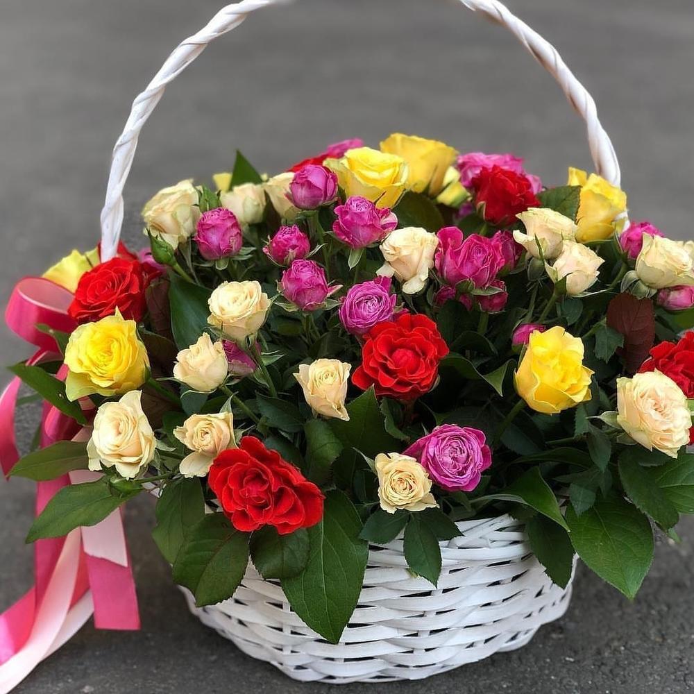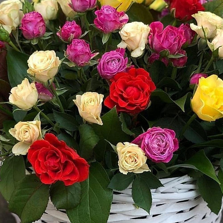 Состав: Роза кустовая - 20 шт.; Роза Кенийская - 30 шт.; Корзина плетеная - 1 шт.; атласный бант - 1 шт.