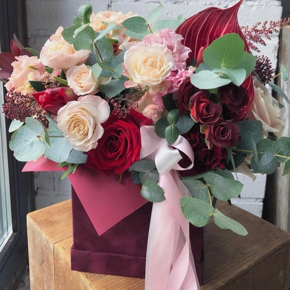 На фото - Красивая композиция цветов «яркость чувств». В составе данной композиции: Антуриум красный - 1 шт.; эустома розовая - 7 шт.; Роза кустовая - 5 шт.; Тюльпан - 3 шт.; Роза Эквадор - 1 шт.; Эвкалипт - 7 шт.; Коробка шляпная - 1 шт..