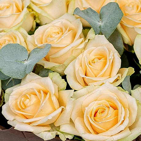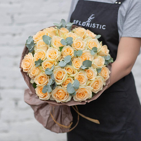 Роза пич аваланш,эвкалипт — отличный выбор для подарка! На сайте вы найдете красочные фотографии, которые помогут сделать выбор. Цена букета — 4000 руб.