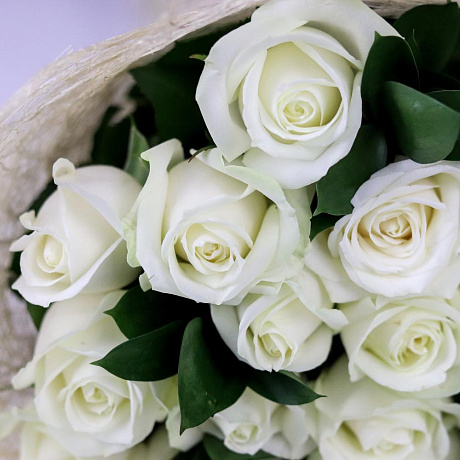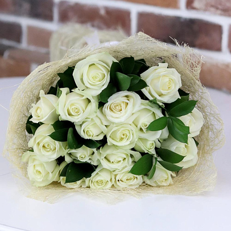Розы. Букет из 19 белых роз с рускусом. N657