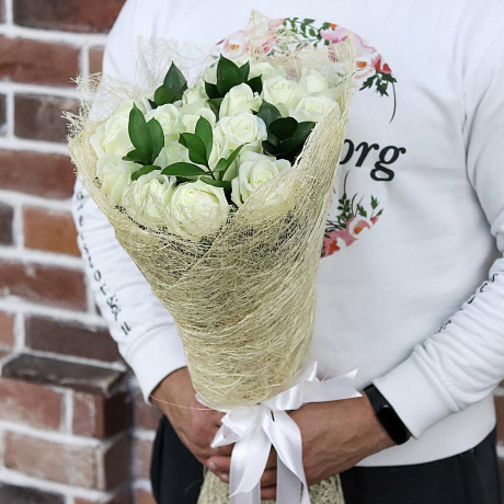 Закажите Розы. Букет из 19 белых роз с рускусом. N657 с доставкой в Москве и МО.