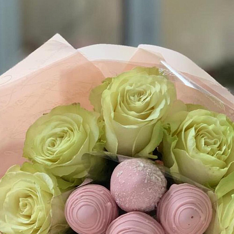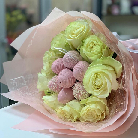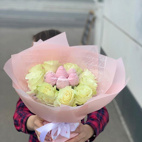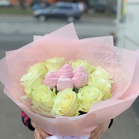 Розы и клубника — отличный выбор для подарка! На сайте вы найдете красочные фотографии, которые помогут сделать выбор. Цена букета — 4400 руб.