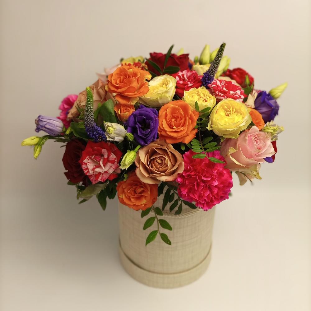 На фото - Букет цветов "Яркие эмоции" №163. В составе данной композиции: Роза Кенийская - 10 шт.; Роза кустовая - 6 шт.; Диантус - 6 шт.; Эустома - 3 шт.; Вероника - 3 шт.; Роза Эквадор - 1 шт.; Писташ - 1 шт.; Коробка шляпная - 1 шт.; Оазис флористический - 1 шт..