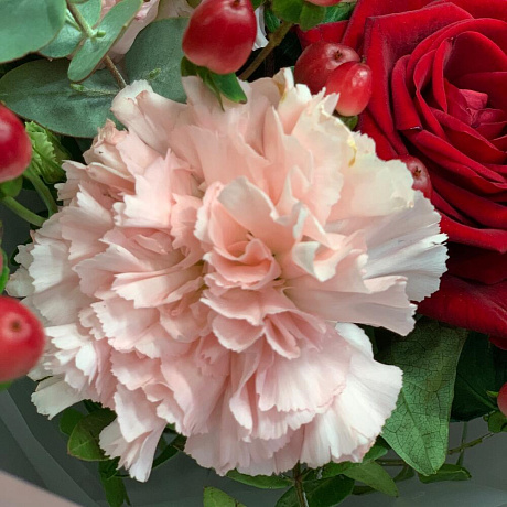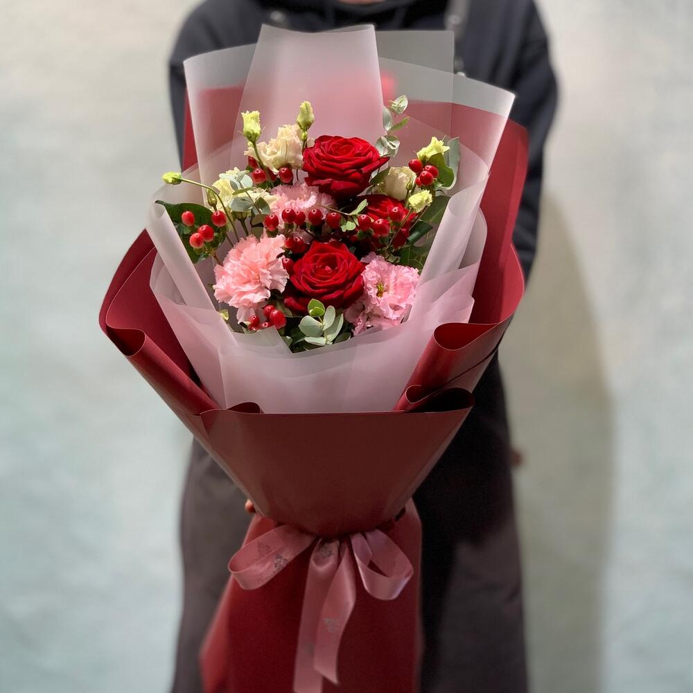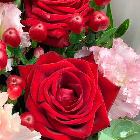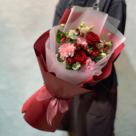 Закажите Яркий букет с розами и ажурным лизиантусом с доставкой в Москве и МО.
