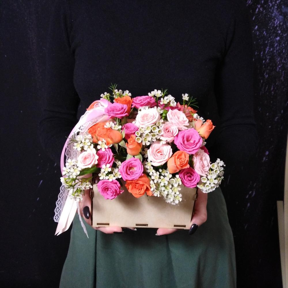 Ящик с кустовой розочкой — отличный выбор для подарка! На сайте вы найдете красочные фотографии, которые помогут сделать выбор. Цена букета — 3150 руб.