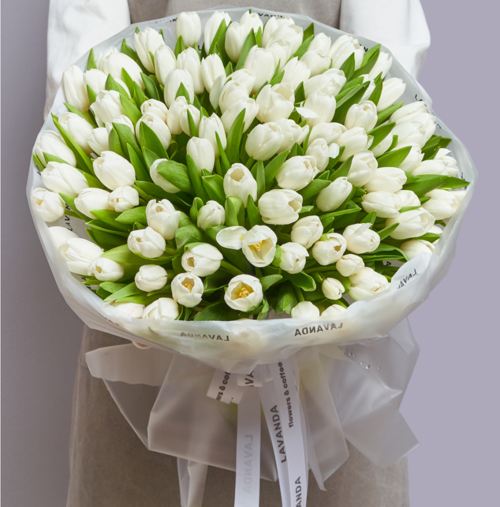 На фото - Тюльпан белый 101 №38. В составе данной композиции: Тюльпан белый - 101 шт.; Лента атласная - 1 шт.; Упаковка дизайнерская - 1 шт..