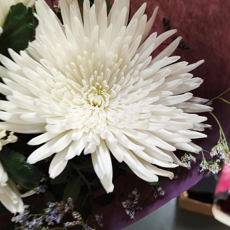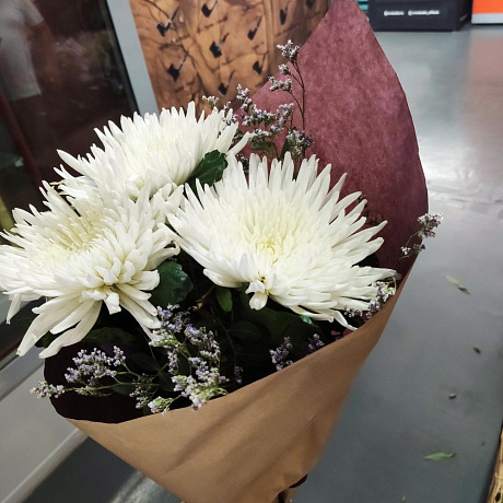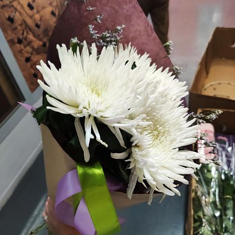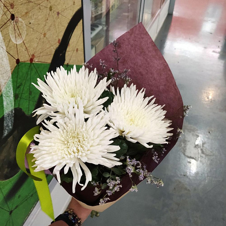 Хризантемы в зелени — отличный выбор для подарка! На сайте вы найдете красочные фотографии, которые помогут сделать выбор. Цена букета — 2750 руб.