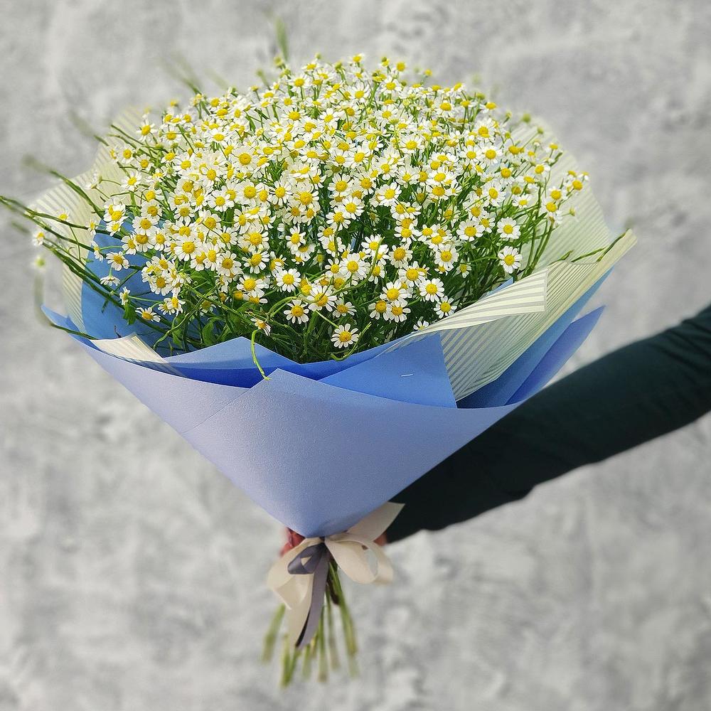 Летний букет ромашек в голубой упаковке №160 — отличный выбор для подарка! На сайте вы найдете красочные фотографии, которые помогут сделать выбор. Цена букета — 3300 руб.