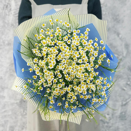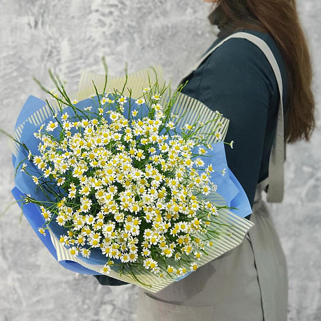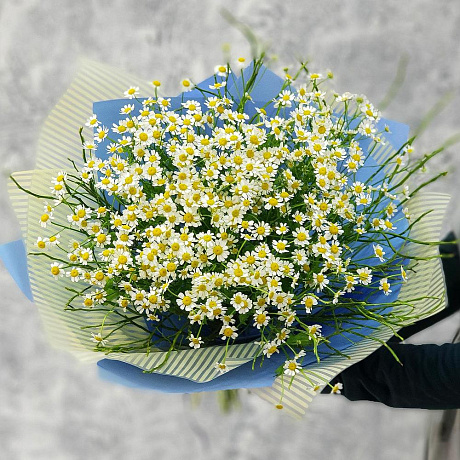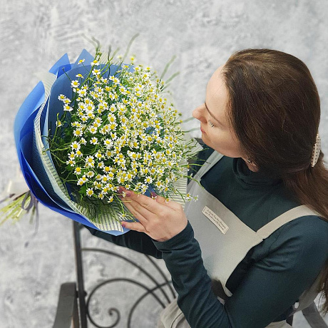 Закажите Летний букет ромашек в голубой упаковке №160 с доставкой в Москве и МО.