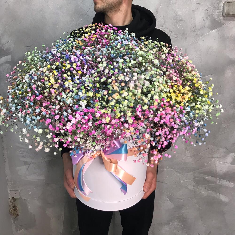 Радужный гифсофила в шляпные каробке — отличный выбор для подарка! На сайте вы найдете красочные фотографии, которые помогут сделать выбор. Цена букета — 7000 руб.