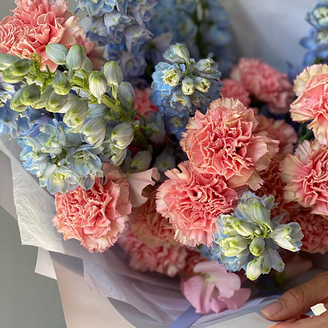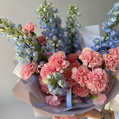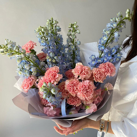 Трио Дельфиниум, Диантус и Латирус — отличный выбор для подарка! На сайте вы найдете красочные фотографии, которые помогут сделать выбор. Цена букета — 7300 руб.