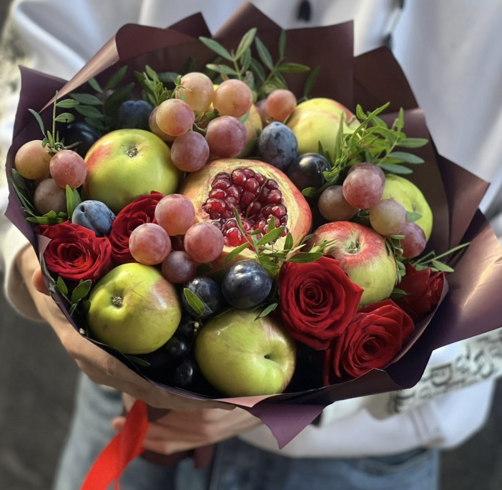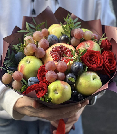 На фото - Букет фруктов с яблоком, сливой и ягодами. В составе данной композиции: .