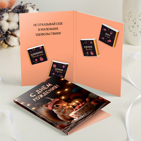 На фото - Открытка с шоколадом "С днем рождения" (белочка).