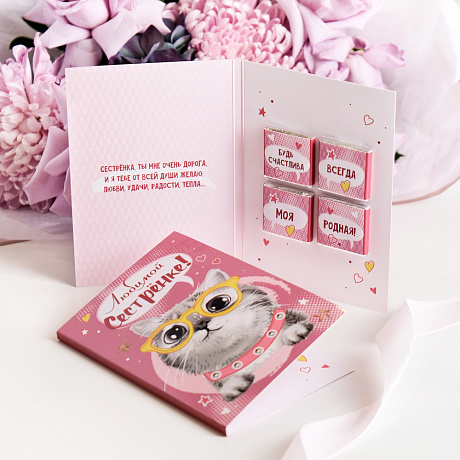 <p>На фото - Открытка с шоколадом "Любимой сестрёнке!".</p> <p>На сайте "Доступная доставка цветов" Вы найдете большой выбор недорогих букетов, цветочных композиций и подарков для любого повода.</p> <p>Букеты и подарки можно заказать с доставкой по Москве: по городу, до дома или в офис.</p>