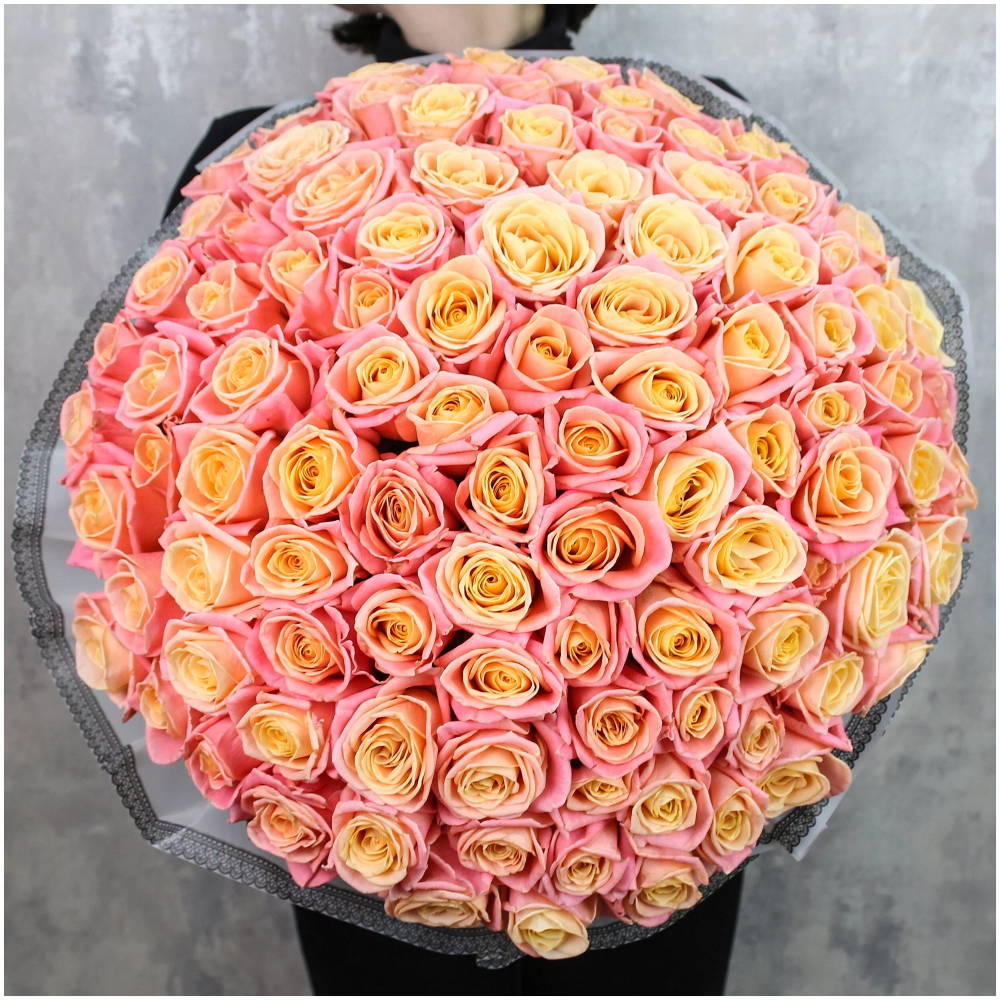 На фото - 101 коралловая роза. В составе данной композиции: Роза голландская - 101 шт.; Крафт упаковка - 1 шт..