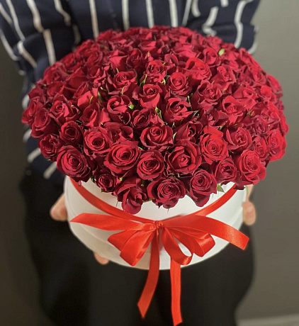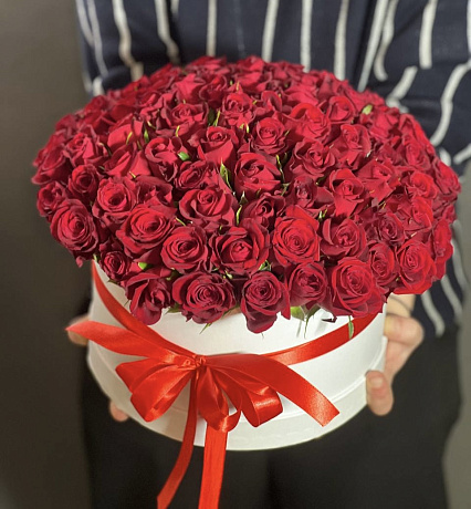 У нас можно заказать 101 красная роза в коробке (Кения) с доставкой по Москве.
