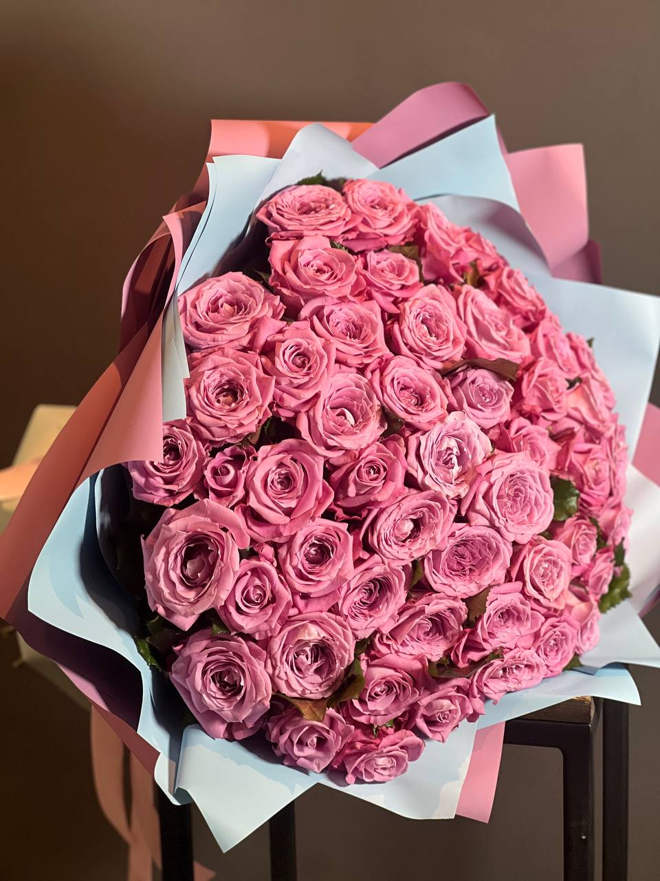 На фото - 101 Роза фуксия №2. В составе данной композиции: эквадор роза 70 см - 101 шт.; Крафт дизайнерский - 1 шт..