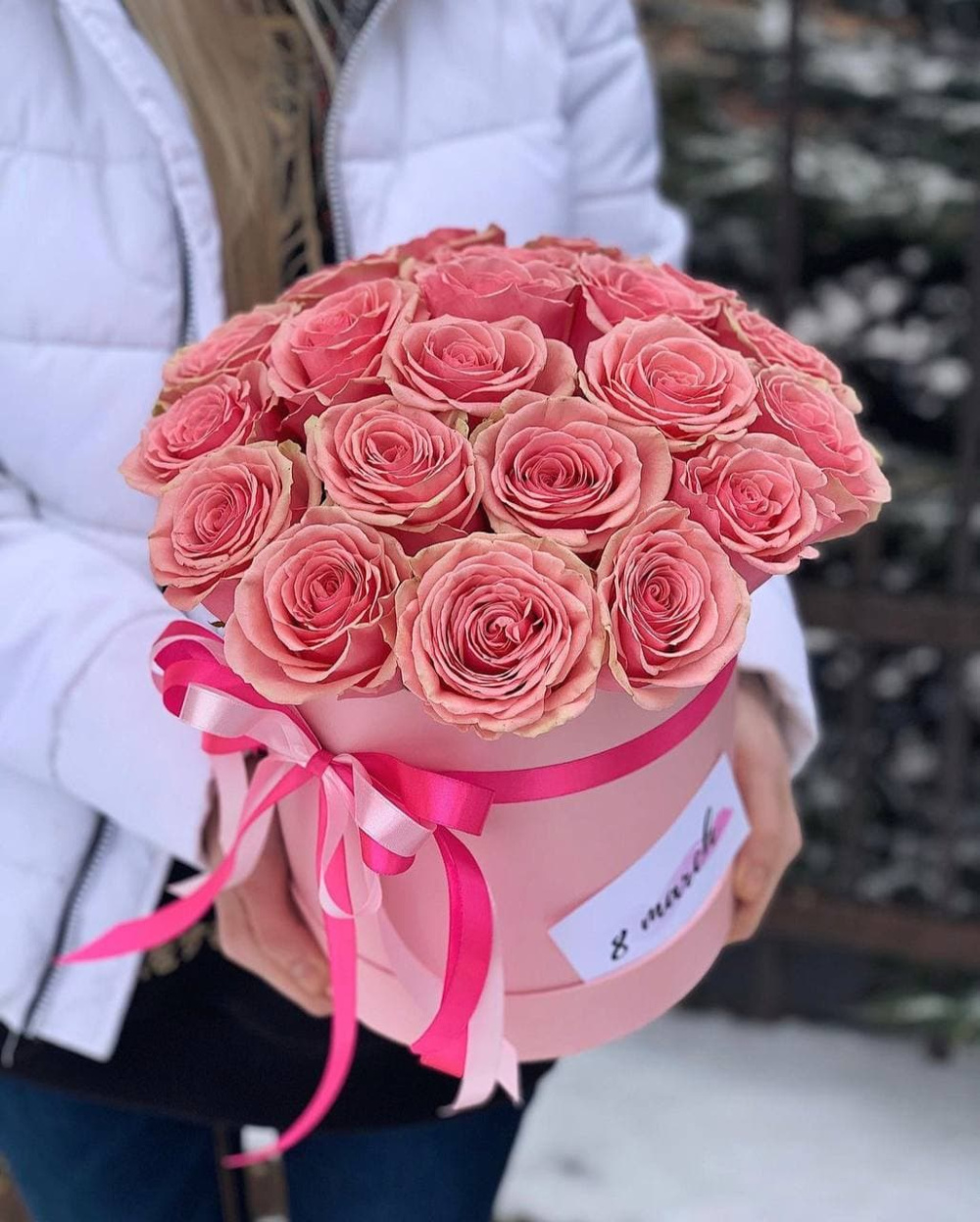 У нас можно заказать 19 персиковых роз премиум в шляпной коробке с доставкой по Москве.