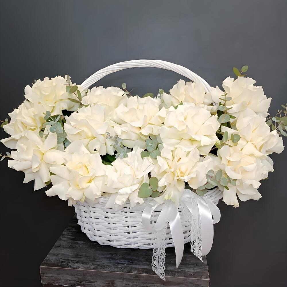 На фото - Белая подарочная композиция из цветов. В составе данной композиции: Роза Мондиаль - 17 шт., Эвкалипт, Корзина, Оазис.