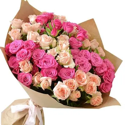 У нас можно заказать Букет из 25 кремовых и розовых кустовых роз с зеленью с доставкой по Москве.