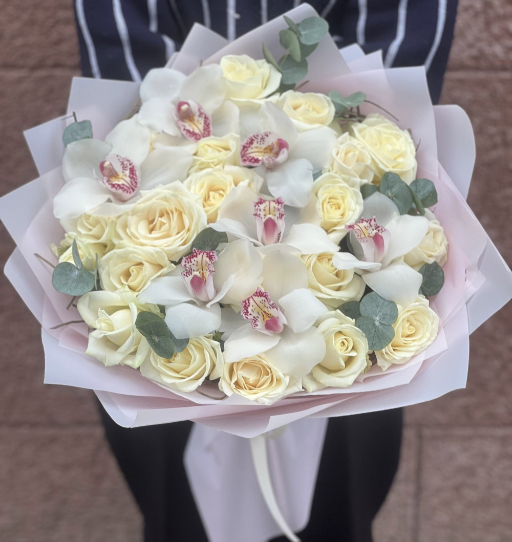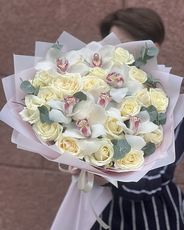 На фото - Букет цветов Фестиваль. В составе данной композиции: Роза - 19, орхидея - 7, эвкалипт 0,1.