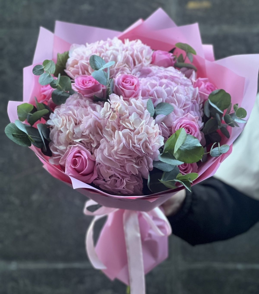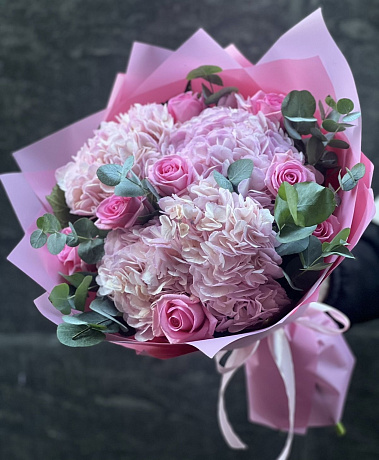 Состав: Гортензия - 3 шт.; роза - 9 шт.; эвкалипт 0,2