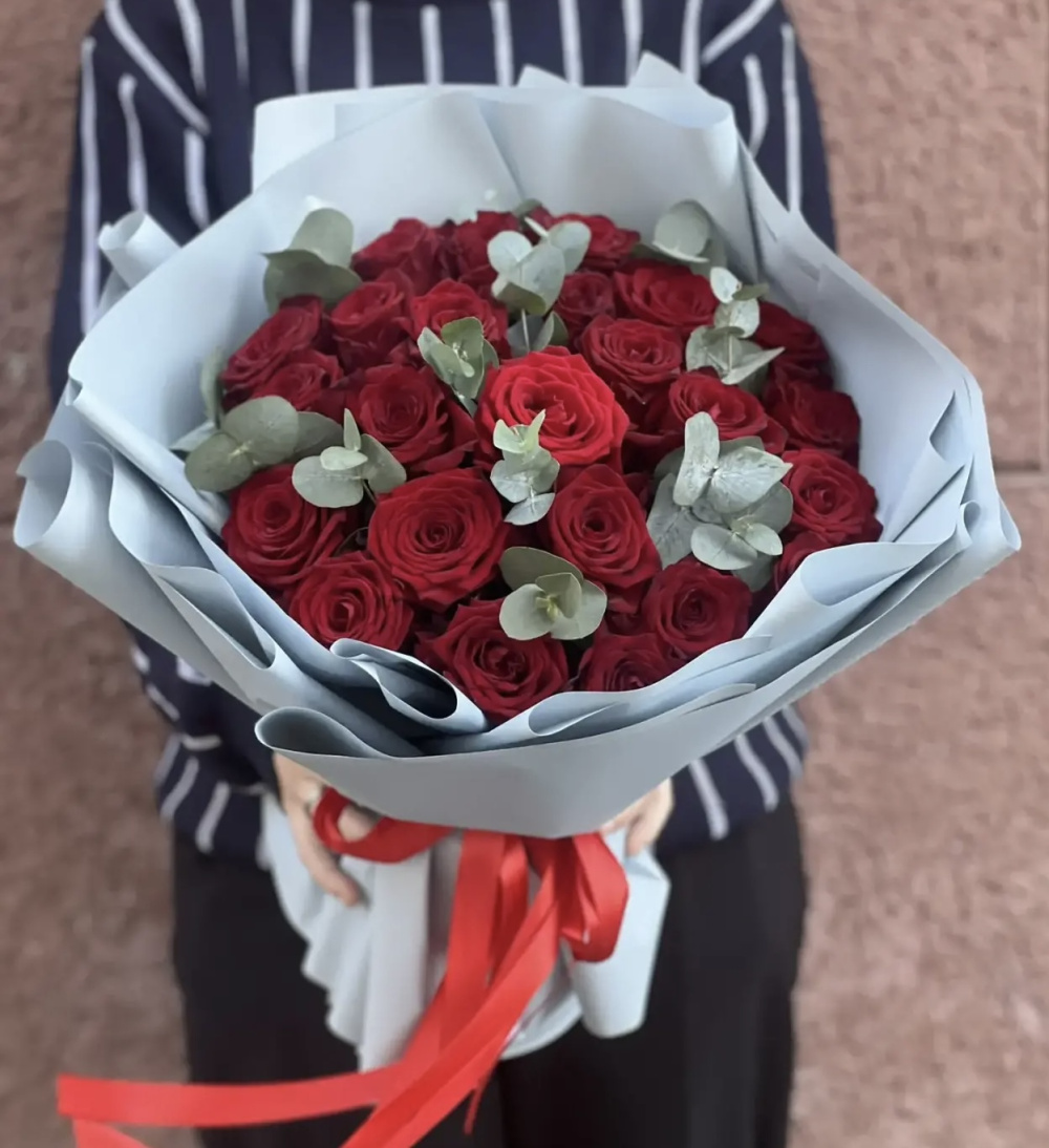 На фото - Букет цветов "Страсть" №202. В составе данной композиции: Роза красная - 25 шт.; эвкалипт 0,1.