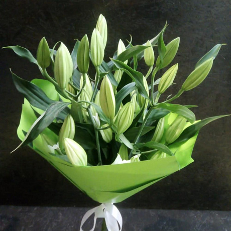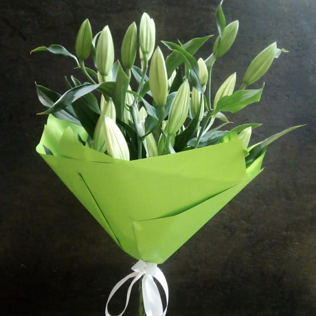 На фото - Букет «Прекрасная Лилия». В составе данной композиции: лилия белая восточная - 5 шт.; Упаковка дизайнерская - 1 шт.; Лента атласная - 1 шт..
