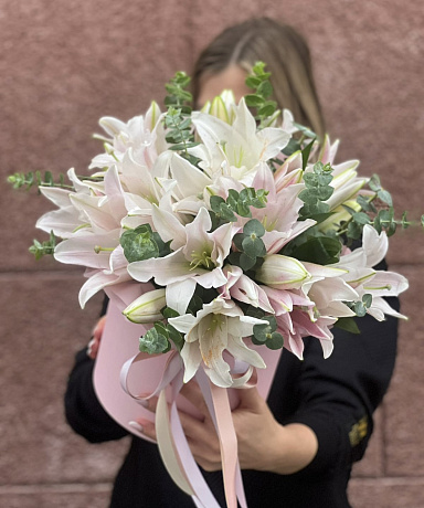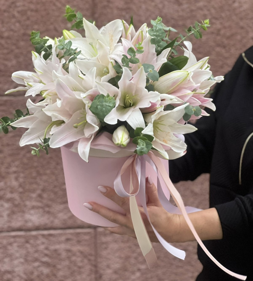 На фото - Цветы в коробке «Мисс Лили». В составе данной композиции: .