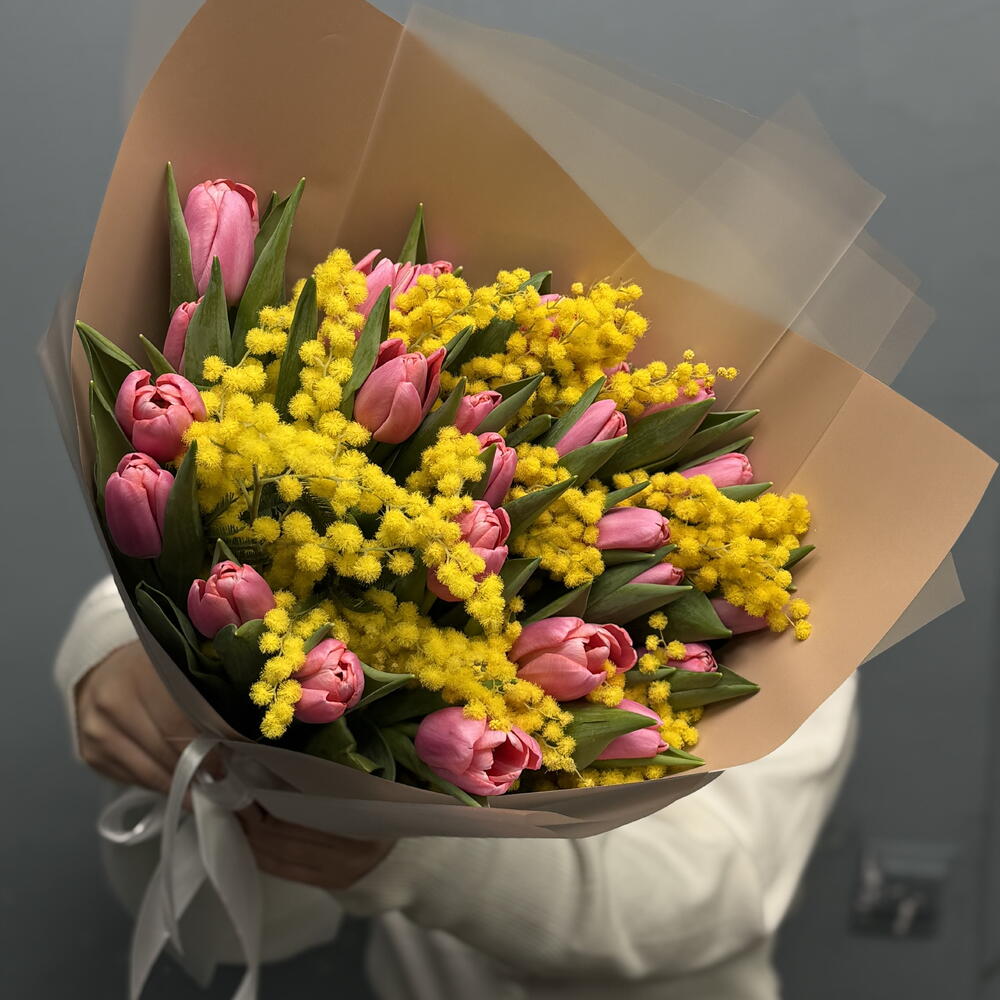 На фото - Весенний март №19. В составе данной композиции: Тюльпан - 25 шт. Мимоза - 10 шт..