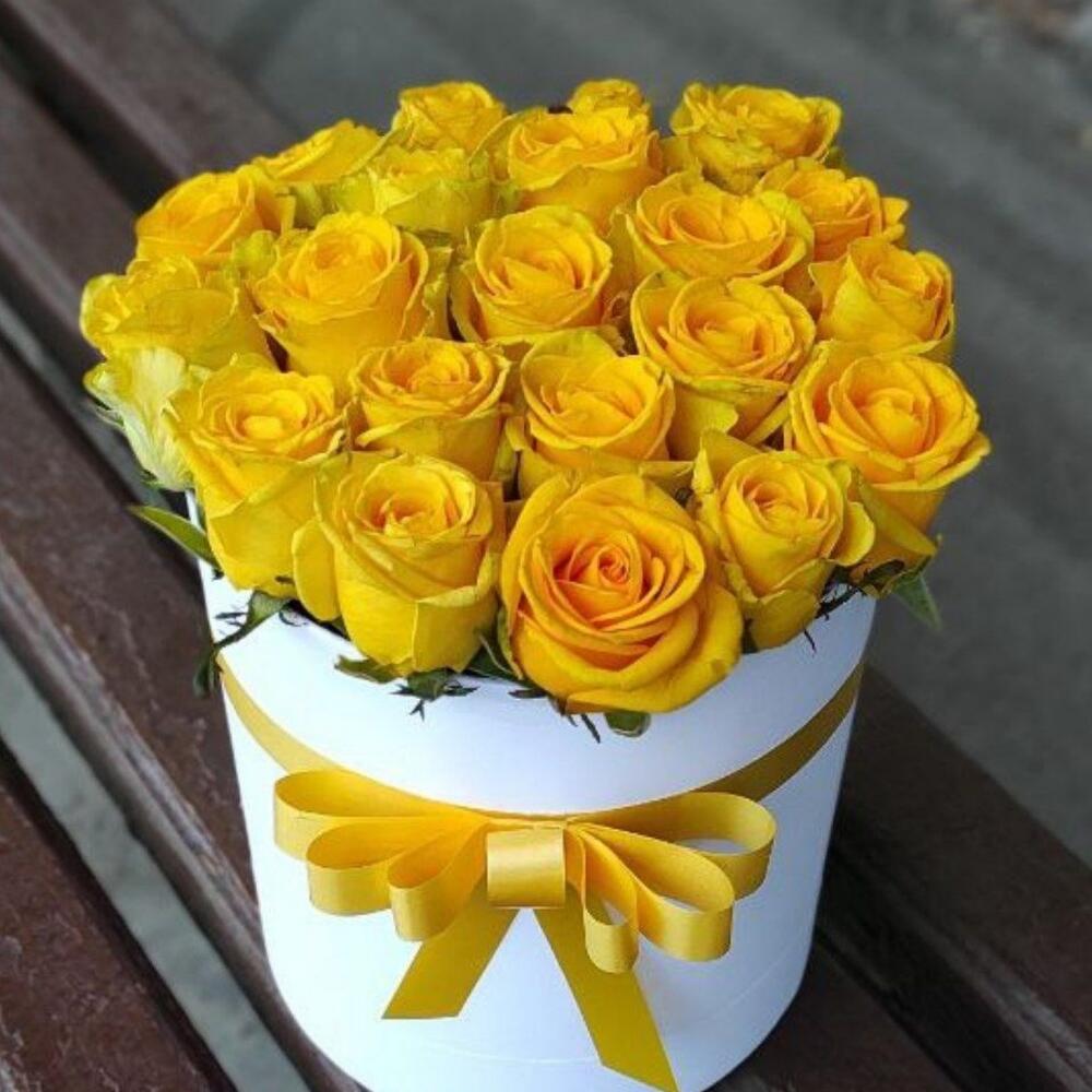 На фото - 21 роза в шляпной коробке №161. В составе данной композиции: Роза - 21 шт.; Шляпная коробка - 1 шт.; Губка флористическая - 1 шт.; Лента - 2 шт..