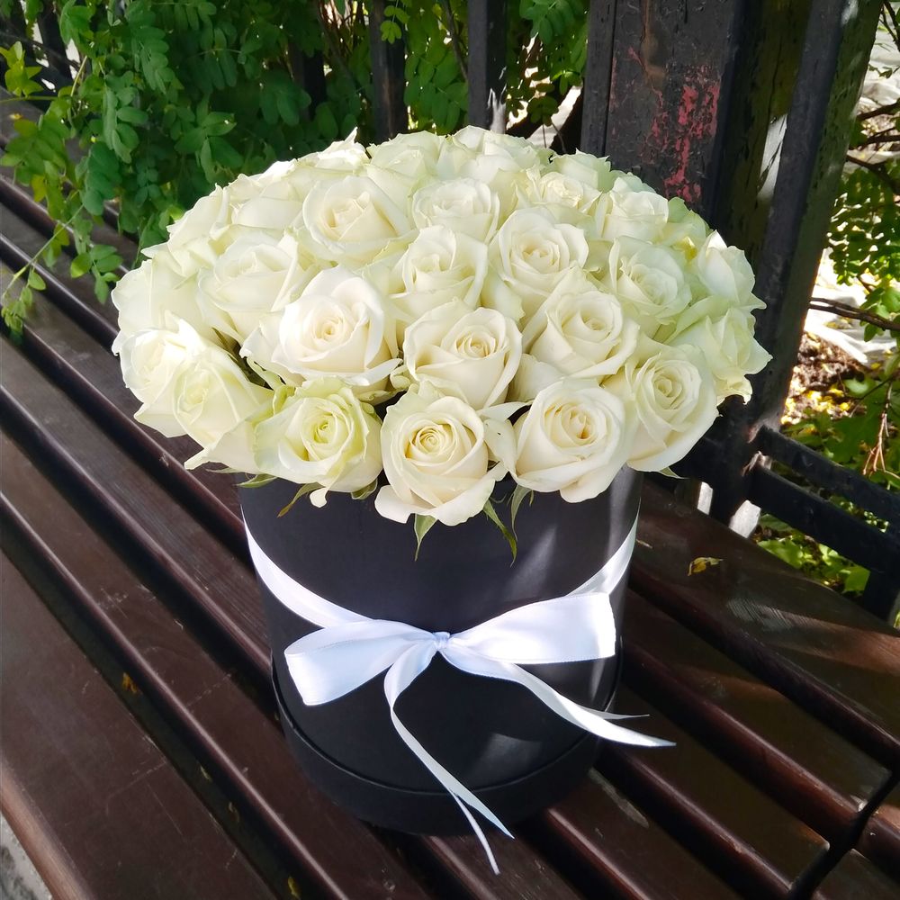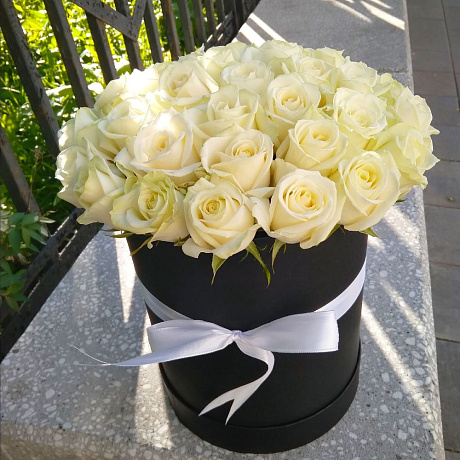 У нас можно заказать 35 белых роз в чёрной шляпной коробке с доставкой по Москве.