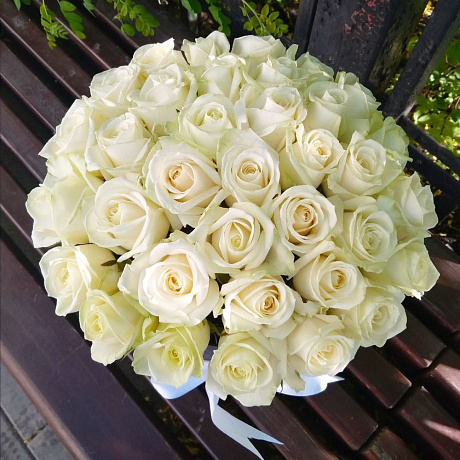На фото - 35 белых роз в чёрной шляпной коробке. В составе данной композиции: белая роза - 35 шт.; Шляпная коробка - 1 шт.; Лента атласная - 1 шт..