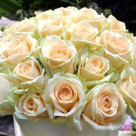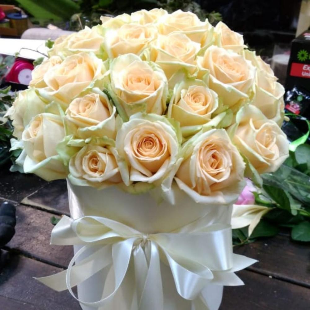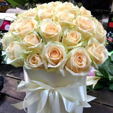 У нас можно заказать 39 кремовых роз в шляпной коробке с доставкой по Москве.