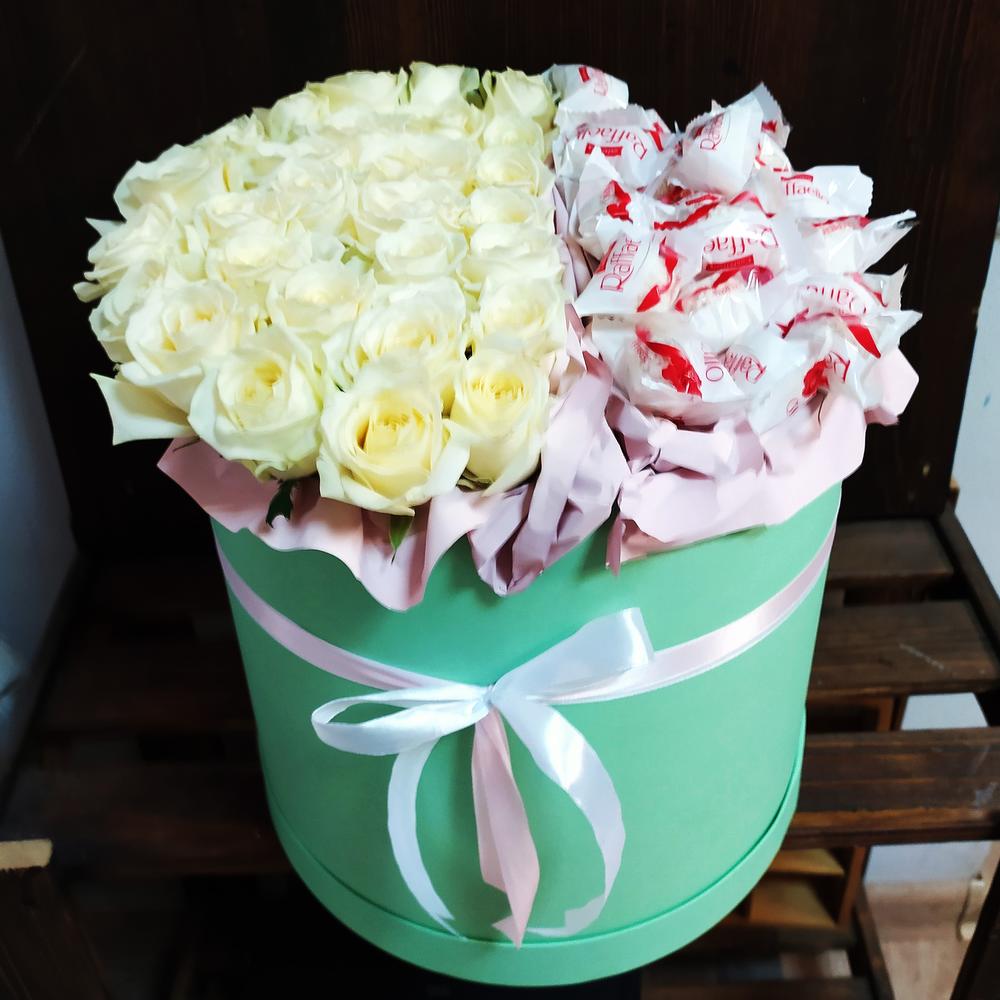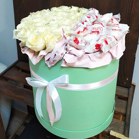 На фото - Авторская шляпная коробка "Розы и рафаэлки". В составе данной композиции: Роза - 25 шт.; Раффаэлло - 200 гр.; Коробка шляпная - 1 шт.; Оазис флористический - 2 шт.; Лента атласная - 2 шт..