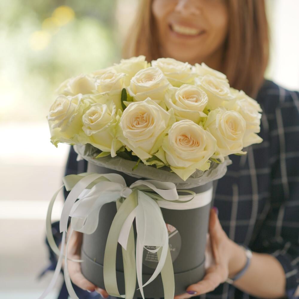У нас можно заказать Белые розы в коробке №161 с доставкой по Москве.